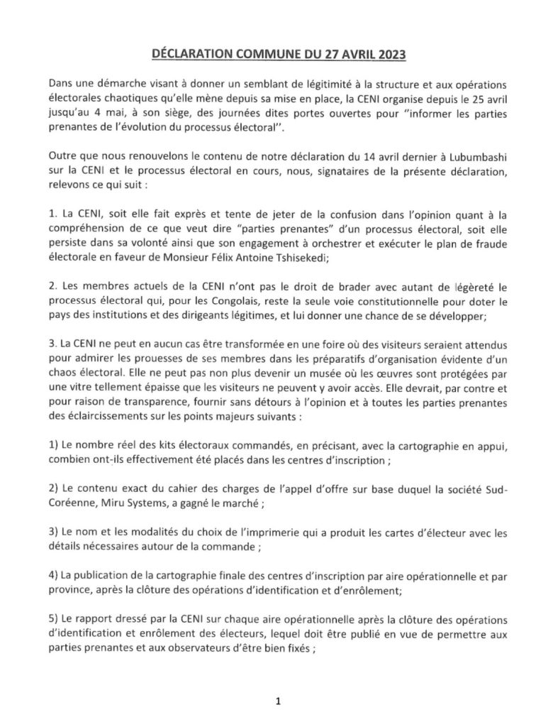 Dans une déclaration commune, les partis politiques Leadership et gouvernance pour le développement (LGD), Engagement pour la citoyenneté et le développement (ECIDé), Ensemble des volontaires pour le redressement de la RDC (Envol) et Ensemble pour la République, ont à l’opération ‘’Journées portes ouvertes’’ de la CENI.