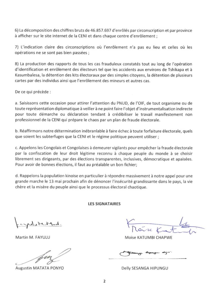 2. Les membres actuels de la CENI n’ont pas le droit de brader avec autant de légèreté le processus électoral qui, pour les Congolais, reste la seule voie constitutionnelle pour doter le pays des institutions et des dirigeants légitimes, et lui donner une chance de se développer;