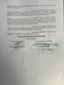 «Informée de l’imminence d’une autopsie à réaliser, sous cette plume, la famille qui demeure disposée à accompagner le Parquet, rappelle les termes de la susdite lettre et vous prie de la fixer sur l’identité des médecins légistes qui vont réaliser cette autopsie ainsi que leurs domaines de compétence. Du point de vue de la famille Chérubin Okende, pour la sincérité des conclusions de l’autopsie à réaliser, elle exige qu’elle soit faite avec la participation des médecins légistes de la MONUSCO et de ceux d’au moins trois pays étrangers, tel qu’annoncé par le Gouvernement de la République. Ceci aura le mérite d’éviter des conclusions non conformes à la réalité. Comptant sur votre diligence habituelle, nous osons croire que vous rencontrerez les préoccupations ici exprimées et demeurons dans l’attente d’une invitation formelle du représentant de la famille» (Avocats).